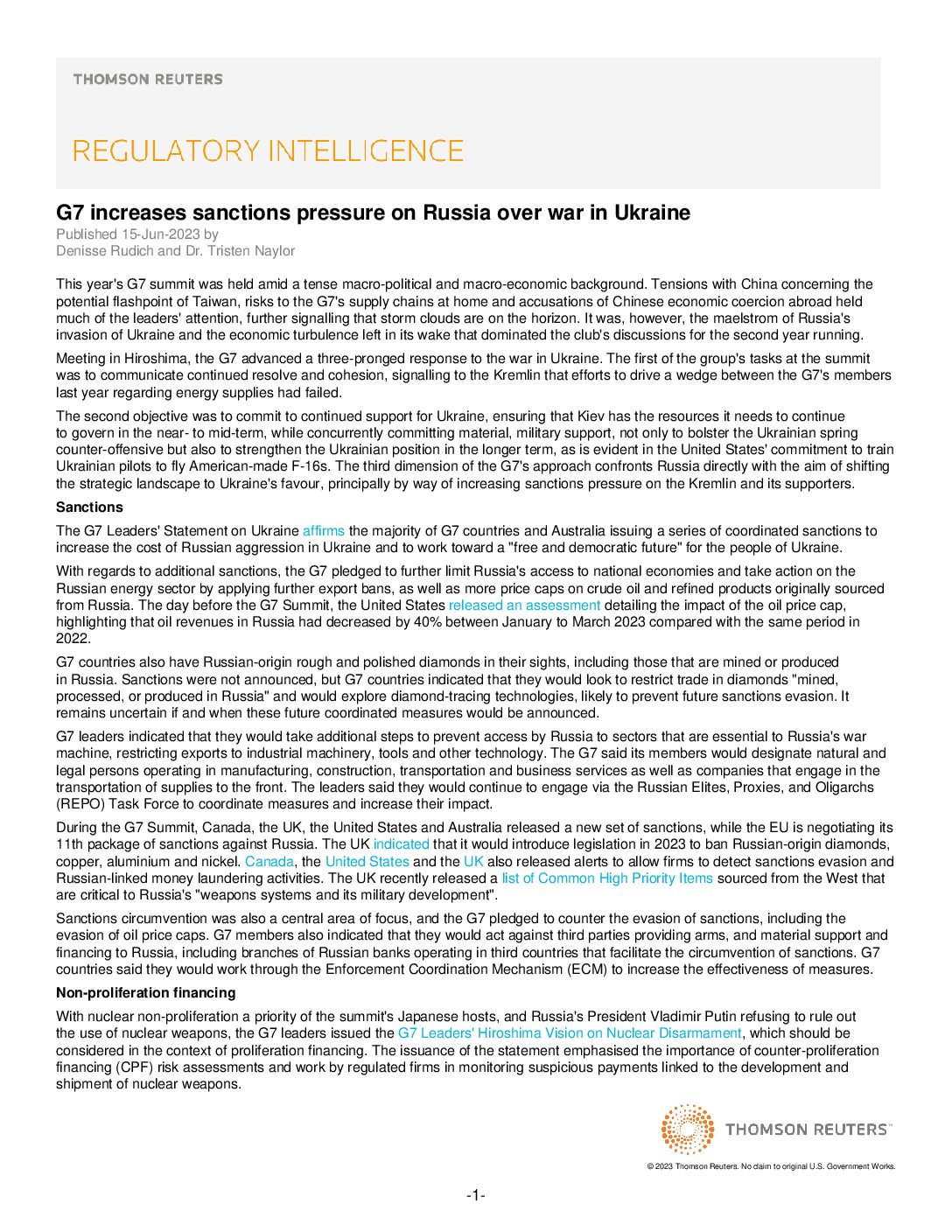 G7 increases sanctions pressure on Russia over war in UkraineDenisse Rudich2025-12-19T00:38:34+00:00June 15th, 2023|engagement_type: Publication| place: Thomson Reuters Accelus|